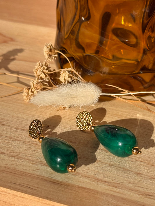 Boucles d’oreilles Vert Envoûtant – Acier inoxydable doré & perle poire résine vert profond