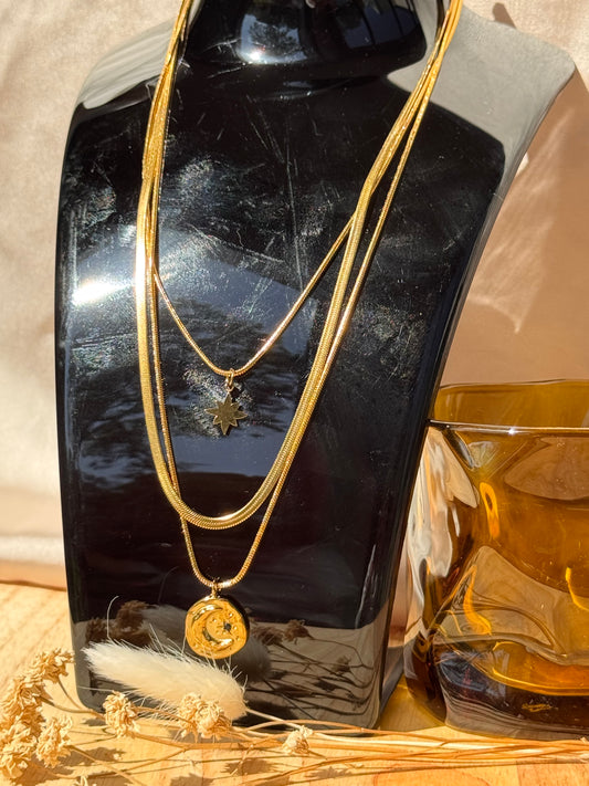 01.Collier Astralis – 3 chaînes superposées en acier inoxydable doré avec pendentifs étoile & lune