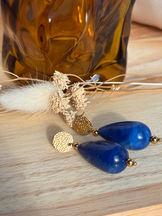 Boucles d’oreilles Bleu Nuit – Création artisanale en acier inoxydable doré & perle poire résine